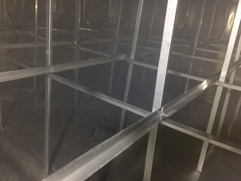 主拉主要作用是防止水箱變形,厚度一般采用靠近底板的側板厚度為基準,規格為4cm*4cm。其焊接間距一般為1000mm一條,大型水箱特別是高度超過3米以上的。其間距應該為500mm一條,連接處必須進行滿焊處理。